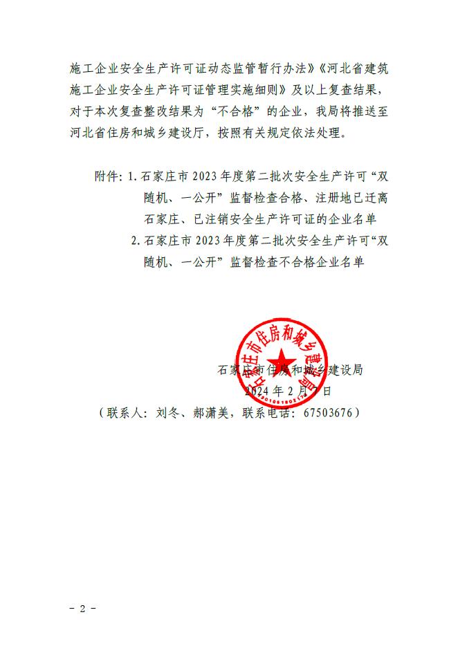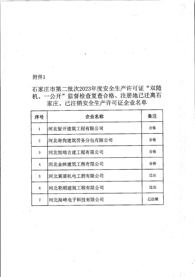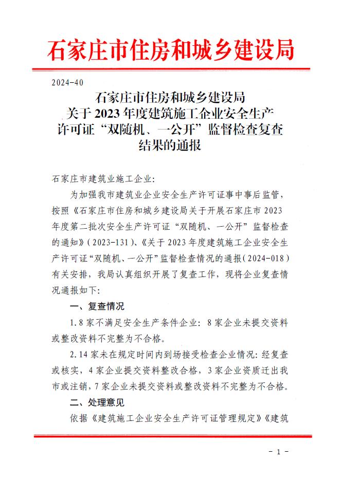 关于2023年度建筑施工企业安全生产许可证“双随机、一公开”监督检查复查结果的通报